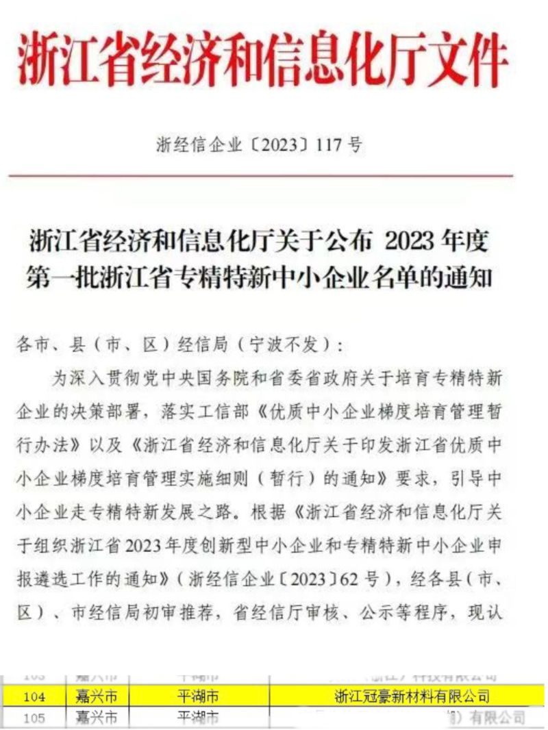 近日,浙江省經(jīng)信廳公布了《關(guān)于2023年度第一批浙江省專精特新中小企業(yè)》名單,浙江冠豪順利通過省級“專精特新”企業(yè)認定工作,并取得了證書。