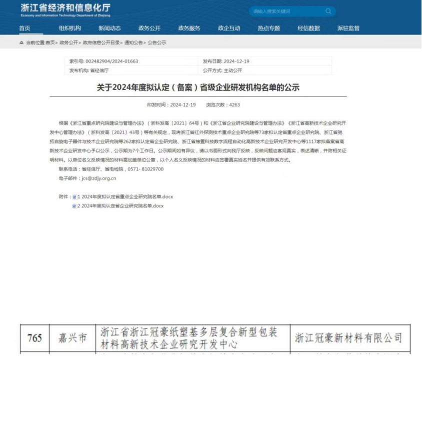 近日,浙江省經濟和信息化廳公示了 2024 年度省級企業研發機構認定結果,浙江冠豪順利通過浙江省高新技術企業研究開發中心認定,被正式授予“浙江省浙江冠豪紙塑基多層復合新型包裝材料高新技術企業研究開發中心”稱號,這一重要成果標志著浙江冠豪在科技創新和研發能力方面邁出了堅實的一步。